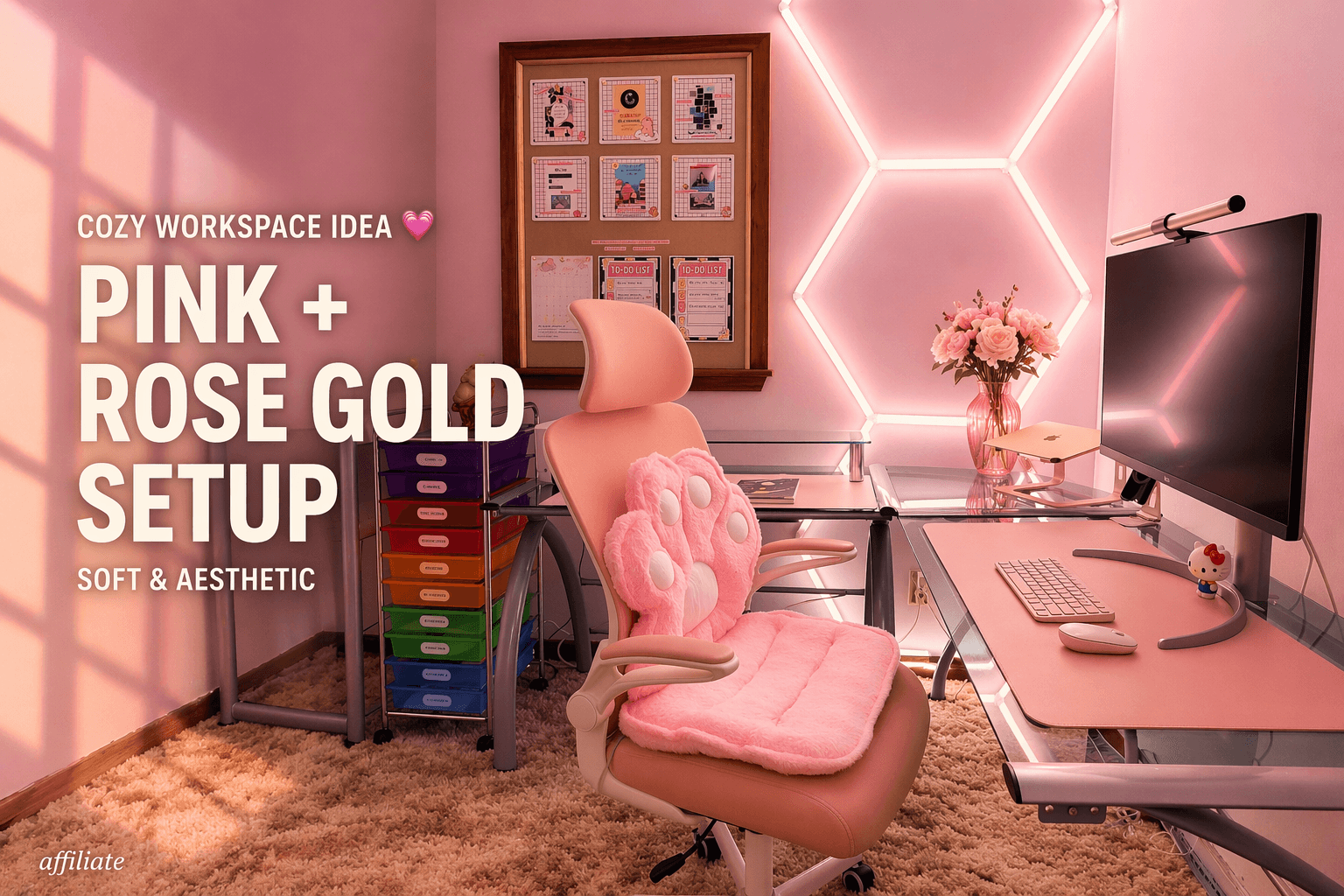 If you’re dreaming of a pink home office setup with rose gold, this cozy and aesthetic workspace idea is one of my favorites. I’ve been slowly building my own setup with soft pink tones and rose gold accents, and it makes working feel so much more enjoyable every day.
